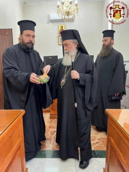 Ο Πατριάρχης Ιεροσολύμων κ.κ. Θεόφιλος υποδέχθηκε, στις 13 Φεβρουαρίου, τον Προϊστάμενο της Ρωσικής Αποστολής στα Ιεροσόλυμα (MISSIA) Αρχιμανδρίτη π. Βασιανό για την παρουσίαση και ευλογία του νέου Ιερομονάχου, για να υπηρετήσει στην Μονή Αρχιμανδρίτη π. Τύχωνος. Ο Μακαριώτατος ευλόγησε την παραμονή αυτού και ευχήθηκε ευδόκιμη διακονία.