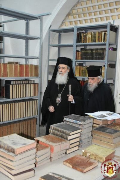 Την βιβλιοθήκη της Ιεράς Μονής Τιμίου Σταυρού επισκέφθηκε πρόσφατα ο Πατριάρχης Ιεροσολύμων κ.κ. Θεόφιλος εποπτεύοντας και επαινώντας τις προσπάθειες που γίνονται για την οργάνωση και συνέχιση της λειτουργίας της.