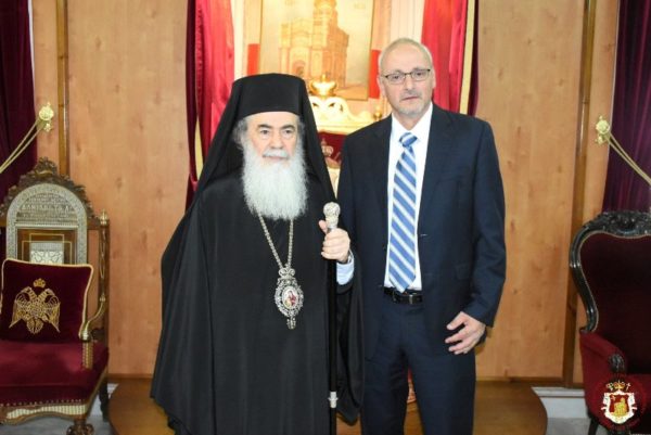 Το Πατριαρχείο Ιεροσολύμων επισκέφθηκε σήμερα ο νέος μελλοντικός Πρέσβης του Ισραήλ στην Ελλάδα κ. Νόαμ Κατζ μετά της συνοδού αυτού κ. Τάνη από το Υπουργείον Εξωτερικών του Ισραήλ. Τον νέο Πρέσβη και την συνοδείαν αυτού υποδέχθηκε ο Πατριάρχης Ιεροσολύμων κ.κ. Θεόφιλος μετά Πατέρων Αγιοταφιτών.
