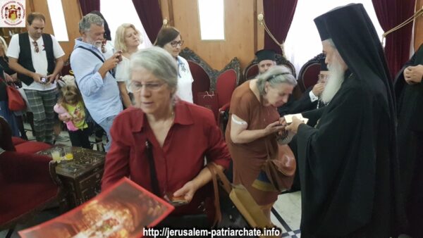 Τους προσκυνητές, τους οποίους συνόδευε ο Σεβ. Μητροπολίτης Πατρών κ. Χρυσόστομος, υποδέχτηκε ο Μακαριώτατος Πατριάρχης Ιεροσολύμων κ.κ. Θεόφιλος. Ο Μακαριώατος απευθύνθηκε με λόγια αγάπης προς τον Σεβασμιώτατο και τους προσκυνητές, με τον Μητροπολίτη κ. Χρυσόστομο να ευχαριστεί και αυτός από την πλευρά του για την θερμή υποδοχή.