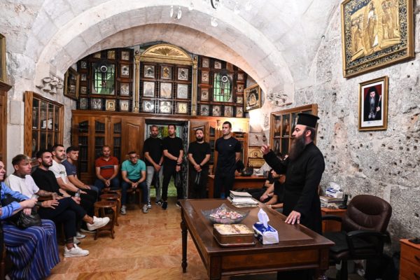 Τα μέλη της αντιπροσωπείας, ανάμεσά τους ο προπονητής της ομάδας, Ραζβάν Λουτσέσκου καθώς και οι Χρήστος Καρυπίδης – Άγγελος Αναστασιάδης, ενημερώθηκαν για την ιστορία του ναού από τον Γέροντα Σκευοφύλακα του Παναγίου Τάφου, Σεβασμιώτατο Αρχιεπίσκοπο Ιεραπόλεως κ. Ισίδωρο.
