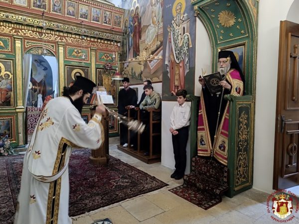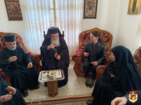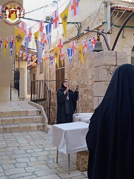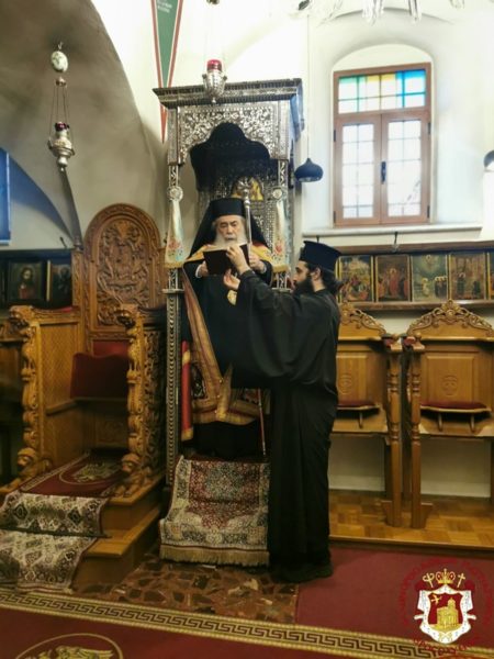 Διαρκούσης της θείας Λειτουργίας επισκέφθηκε την Ιερά Μονή ο Πατριάρχης Ιεροσολύμων κ.κ. Θεόφιλος για να προσκυνήσει προσκύνησει, συνοδευόμενος από Αγιοταφίτες Πατέρες. Την Πατριαρχική συνοδεία, την Αρχιερατική συνοδεία και το ευσεβές εκκλησίασμα δεξιώθηκε η ανακαινίσασα τον Ναό της Μονής και συντηρήσασα τις εικόνες του, ηγουμένη Μελάνη.