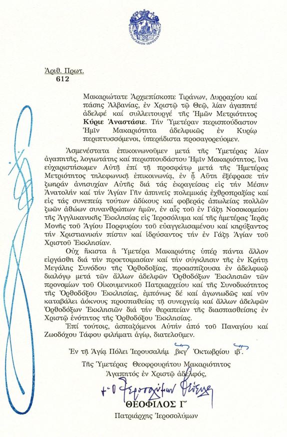 Ο Μακαριώτατος Πατριάρχης Ιεροσολύμων κ.κ. Θεόφιλος με επιστολή του ευχαριστεί τον Μακαριώτατο Αρχιεπίσκοπο Τιράνων και πάσης Αλβανίας κ.κ. Αναστάσιο, για την στήριξή του την περίοδο των εχθροπραξιών στη Μέση Ανατολή και τους Αγίους Τόπους, καθώς και για τις προσπάθειες που καταβάλλει για τη θεραπεία της διασπασμένης ενότητας της Ορθόδοξης Εκκλησίας εν Χριστώ.