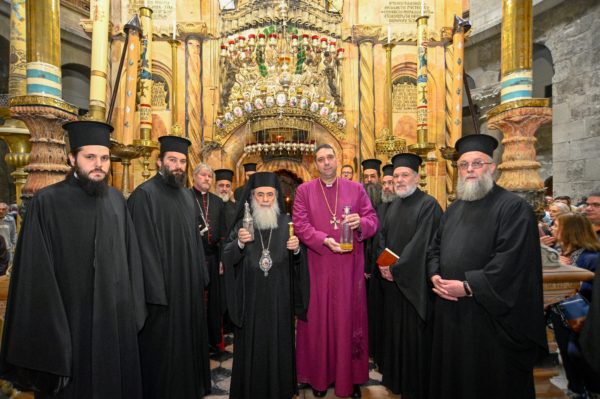 Ο πατριάρχης Ιεροσολύμων Θεόφιλος Γ΄ και ο αρχιεπίσκοπος της Αγγλικανικής Εκκλησίας στο Ισραήλ Χοσάμ Ναούμ καθαγίασαν το μύρο στον Ναό της Αναστάσεως, αναφέρει η ανακοίνωση.