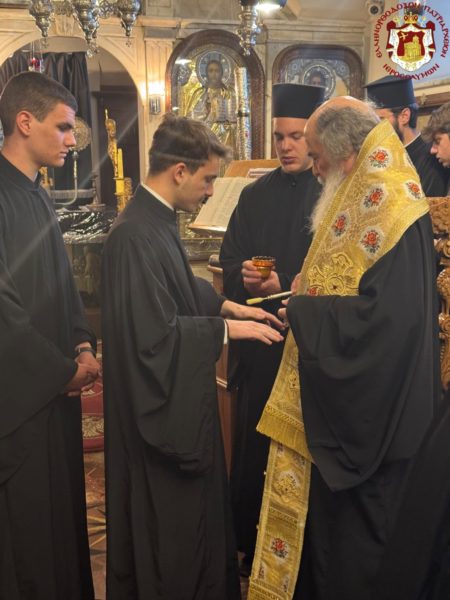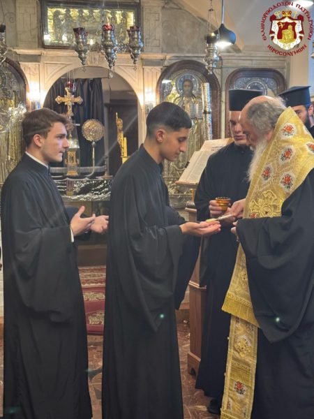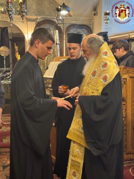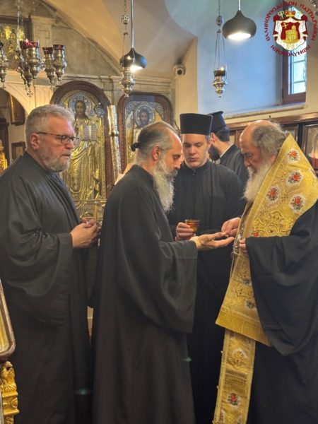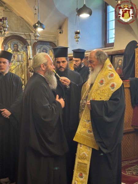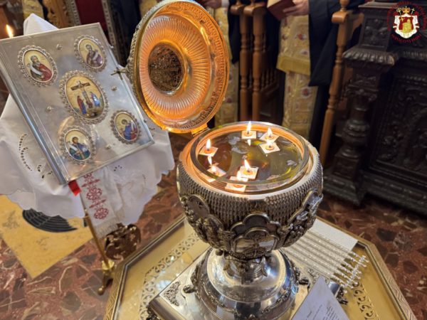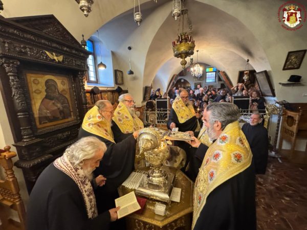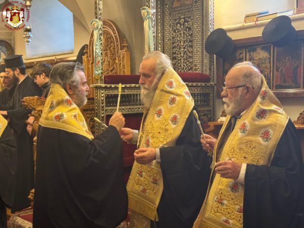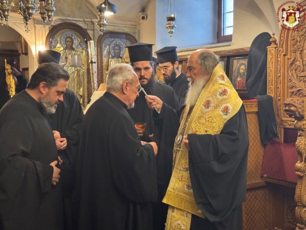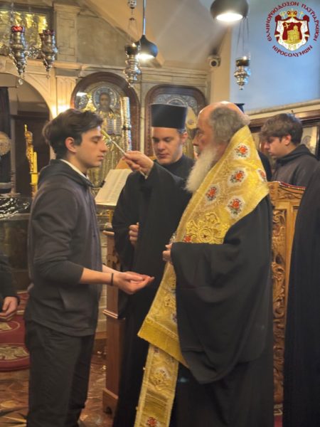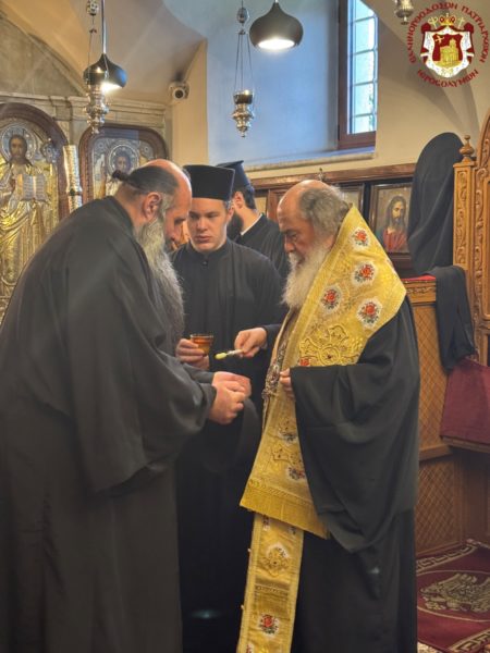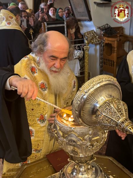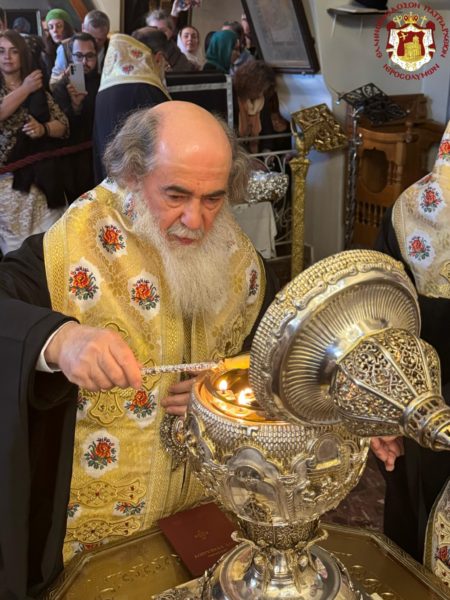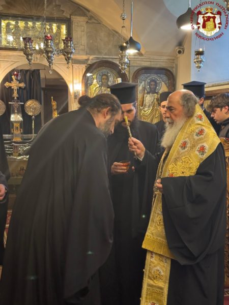 Στον Ιερό Μοναστηριακό Ναό των Αγίων Κωνσταντίνου και Ελένης στα Ιεροσόλυμα τελέστηκε το απόγευμα της Μεγάλης Τετάρτης 16ης Απριλίου 2025 το Μυστήριο του Ιερού Ευχελαίου, προεξάρχοντος του Μακαριωτάτου Πατριάρχου Ιεροσολύμων κ.κ. Θεοφίλου και συνιερουργούντων πέντε Αγιοταφιτών Αρχιερέων και του παρεπιδημούντος Σεβασμιωτάτου Μητροπολίτου Ανέων κ. Μακαρίου, του Οικουμενικού Πατριαρχείου, για να είναι μαζί με τον προεξάρχοντα επτά στον αριθμό, όσα και τα Αποστολικά αναγνώσματα και οι Ευαγγελικές περικοπές του Μυστηρίου αυτού.