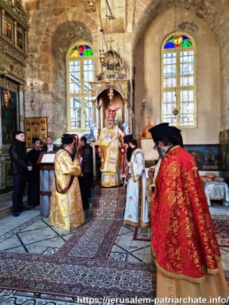 Διαρκούσης τῆς θείας Λειτουργίας προσῆλθε διά προσκύνησιν ἡ Α.Θ.Μ. ὁ Πατήρ ἡμῶν καί Πατριάρχης Ἱεροσολύμων κ.κ. Θεόφιλος μετά Πατέρων Ἁγιοταφιτῶν.