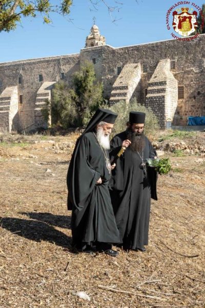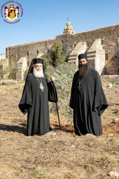Το πρώτο από τα συνολικά εκατό ελαιόδεντρα τα οποία φυτεύτηκαν στον εξωτερικό περίβολο της Μονής του Τιμίου Σταυρού στα Ιεροσόλυμα φύτεψε ο Πατριάρχης Ιεροσολύμων κ.κ. Θεόφιλος. Στη συνέχεια ο Μακαριώτατος επιθεώρησε τα έργα συντήρησης και ανακαίνισης εντός της Μονής.
