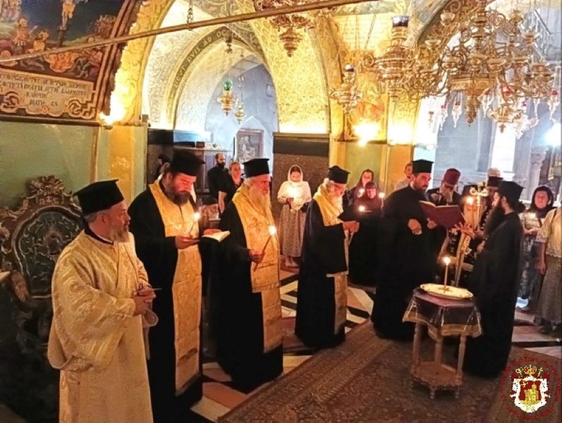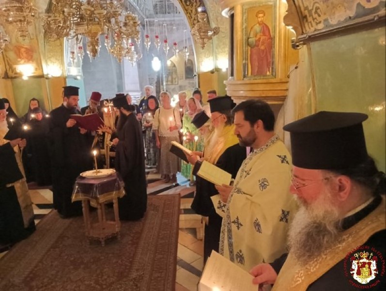 Του Μνημοσύνου, προεξήρξε ο Πατριάρχης Ιεροσολύμων κ.κ. Θεόφιλος, κατελθών εκ της Αδελφότητος, συνιερουργούντων Αυτώ Αγιοταφιτών Αρχιερέων, Ιερομονάχων και Διακόνων και προσευχομένων μοναχών, μοναζουσών και προσκυνητών.