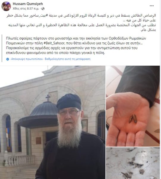 Συγκεκριμένα, τον γύρω του κόσμου έκανε μια ανάρτηση στο Facebook που δείχνει τις αδέσποτες σφαίρες γύρω από την Ιερά Μονή στο Μπετ Σαχούρ.