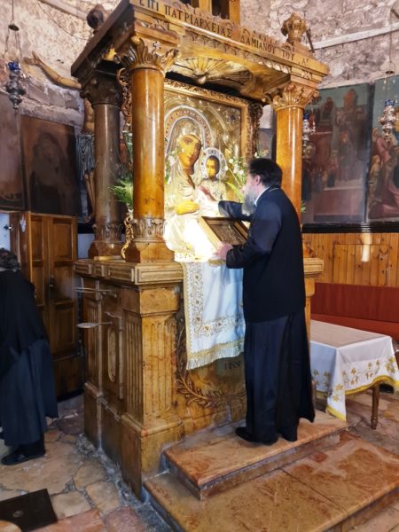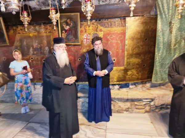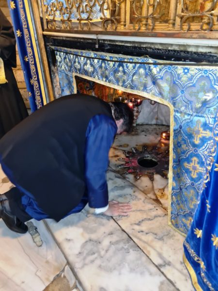 Πρῶτο προσκύνημά μας, τήν ἴδια ἡμέρα τό ἀπόγευμα, ὑπήρξε ἡ ἁγία πόλη τῆς Βηθλεὲμ καὶ ἡ Βασιλικὴ τῆς Γεννήσεως. Ὁ περικαλλὴς Ναὸς ποὺ κτίσθηκε καὶ ἐξωραΐσθηκε μὲ τὴν φροντίδα τῶν ἁγίων θεοστέπτων βασιλέων καὶ ἱσαποστόλων Κων/νου καὶ Ἑλένης, ἀγκαλιάζει στοργικὰ τὸ «θεοδέγμον σπήλαιον», τὸν τόπο ποὺ γεννήθηκε ὁ θεάνθρωπος Κύριός μας. Μετὰ τὴν ἐγκάρδια ἀρχιερατικὴ ὑποδοχὴ στὸ Καθολικὸ τοῦ Ναοῦ ἀπὸ τὸν Πατριαρχικό Ἐπίτροπο, Σεβ. Μητροπολίτη Διοκαισαρείας κ. Βενέδικτο, συμφώνως πρὸς τὴν τάξη τῆς Ἐκκλησίας τῶν Ἱεροσολύμων, κατευθυνθήκαμε λιτανευτικῶς πρὸς τὸν ἱερὸ τόπο ποὺ γεννήθηκε ὁ Σωτήρας τοῦ κόσμου, ψάλλοντας τροπάρια ἀπὸ τὴν ἀκολουθία τῶν Χριστουγέννων.