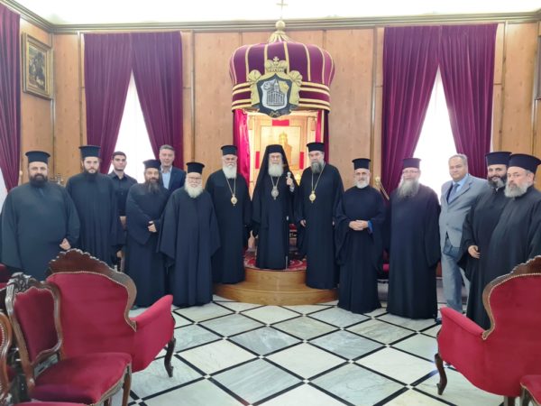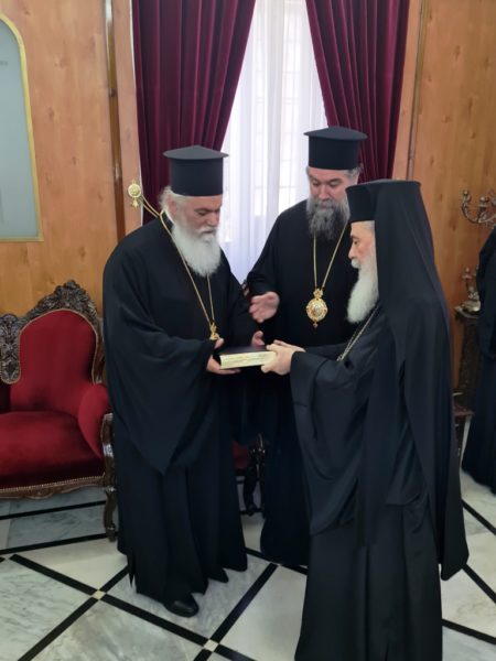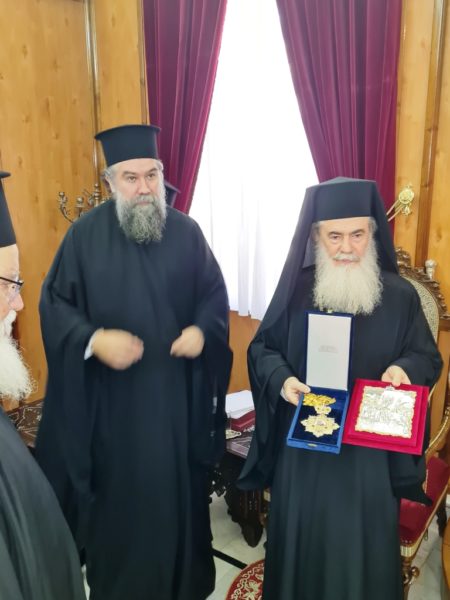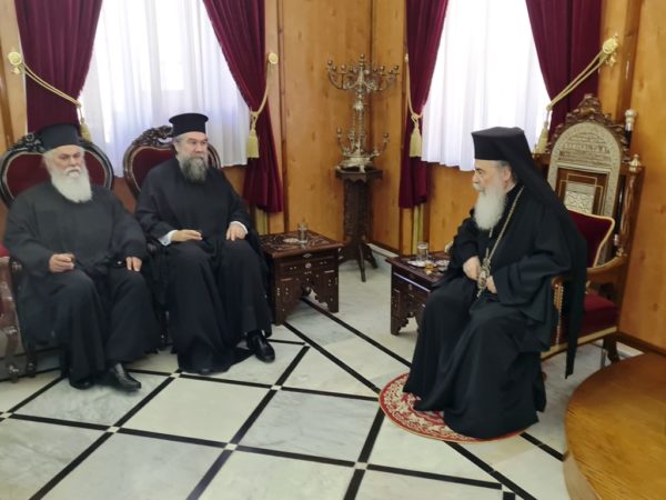 Τὴν Πέμπτη τό πρωΐ, καθηκόντως καί «ἀγαλλομένῳ ποδί» ἐπισκεφθήκαμε τὸ Ἑλληνορθόδοξο Πατριαρχεῖο Ἱεροσολύμων γιὰ τὴν συνάντηση μας μὲ τὸν Προκαθήμενο τῆς Σιωνίτιδος Ἐκκλησίας, Μακαριώτατο Πατριάρχη Ἱεροσολύμων κ. Θεόφιλο. Ὁ Μακαριώτατος, ἂνθρωπος στολισμένος μὲ πολλὰ καὶ πνευματικὰ χαρίσματα, ἡγέτης καὶ οἰακοστρόφος ἂριστος τῆς Σιωνίτιδος Ἐκκλησίας, καλωσορίζει ἐγκάρδια τοὺς Σεβασμιωτάτους Ἀρχιερείς καὶ ὅλους μας συνολικῶς καὶ εὐχαριστεῖ ταπεινὰ γιὰ τὴν ἀγάπη καὶ τὴν στήριξη πρός τήν ἁγιοταφιτικὴ ἀδελφότητα. Ἡ συνάντηση αὐτὴ ὑπῆρξε γιὰ ὅλους μας ἰδιαιτέρως ἐπικοδομητική. Θαυμάσαμε τὴν ἁπλότητα, τὴν ἀμεσότητα, τὴν ἄριστη θεολογικὴ κατάρτιση, τὴν εὐστροφία, ἀλλὰ καὶ τὴν διοικητικὴ ἱκανότητα τοῦ ἐκκλησιαστικοῦ ἀνδρός.