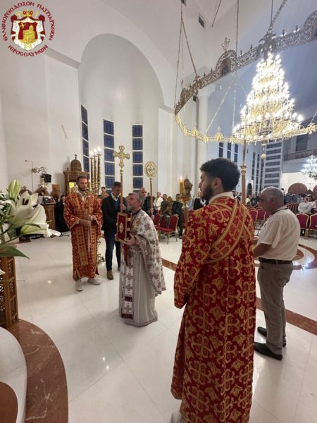 Των ακολουθιών προεξήρξε ο Σεβασμιώτατος Αρχιεπίσκοπος Καττάρων κ. Μακάριος, συλλειτουργούντος του Σταυροφόρου-Οικονόμου π. Μιχαήλ Θεοχαρίδου. Στον Εσπερινό της Παραμονής, αλλά και στην Θεία Λειτουργία της εορτής τους ύμνους έψαλε η χορωδία του Ιερού Ναού αραβιστί, ελληνιστί και σλαυονιστί.