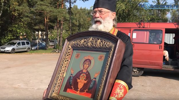 Συνοδεία της θαυματουργής εικόνας της Θεοτόκου του 19ου αιώνα, που θεραπεύει αλκοολικούς και τοξικομανείς πέταξε πάνω από την περιοχή αυτή και έριξε αγιασμό “ώστε να καθαριστεί ο κόσμος από την αμαρτία και τον αλκοολισμό”.