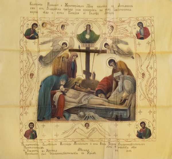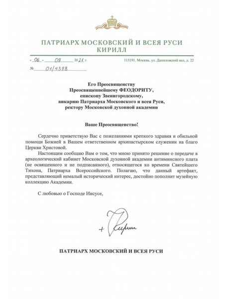 Ένα αντιμήνσιο, που χρονολογείται από την εποχή του Πατριάρχη Μόσχας και πασών των Ρωσιών Τύχωνα, δώρισε στην Εκκλησιαστική-Αρχαιολογική Αίθουσα του Μουσείου της Θεολογικής Ακαδημίας της Μόσχας ο Μακαριώτατος Πατριάρχης Μόσχας κ.κ. Κύριλλος.