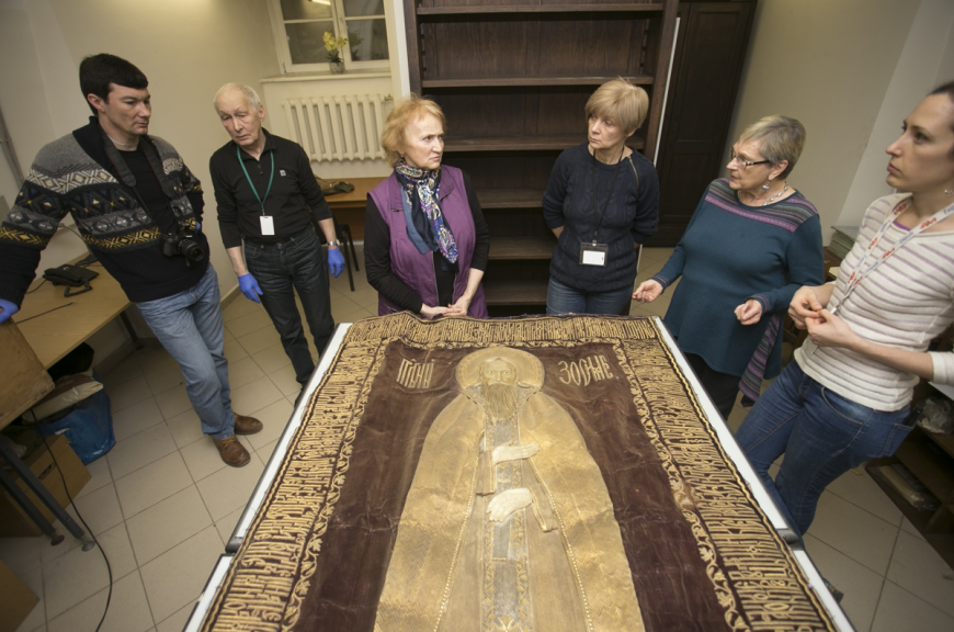 Όπως αναφέρεται, κατά τη διάρκεια των εργασιών στα αρχεία του Επιστημονικού Ινστιτούτου και του μουσείου Ανθρωπολογίας του Κρατικού Πανεπιστημίου Λομονόσοφ της Μόσχας οι επιστήμονες με επικεφαλής την κ. Αλεξάνδρα Μουζίλοβα ανακάλυψαν το χρυσοκέντητο κάλυμμα με εικόνα του Αγίου Ζωσιμά, ιδρυτή της Ιεράς Μονής στις νήσους Σολόβκι. Τα λείψανα του Αγίου Ζωσιμά μετά το 1925 βρίσκονταν υπό την κατοχή της υπηρεσίας NKVD (Εθνικής Υπηρεσίας Ασφαλείας της ΕΣΣΔ) ενώ ύστερα παραδόθηκαν στο Αντιθρησκευτικό Μουσείο, όπου και παρέμεινα μέχρι το 1939 από όπου μεταφέρθηκαν στο μουσείο της θρησκείας του αθεϊσμού στο Λενινγκράντ. Το 1990 τα λείψανα επέστρεψαν στο μοναστήρι, αλλά η τύχη του καλύμματος παρέμεινε άγνωστη μέχρι σήμερα.