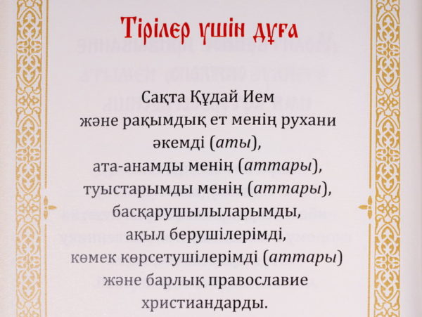 Όλα τα κείμενα στο προσευχητάρι είναι στην Καζακική γλώσσα με παράλληλη μετάφραση στα Ρωσικά, είναι εικονογραφημένο με φωτογραφίες των εικόνων που κοσμούν τους ναούς του Καζακστάν και τις οποίες αγιογράφησε ο S.N. Σοκόλοφ.
