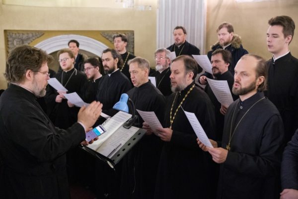 Τους λειτουργικούς ύμνους απέδωσε η χορωδία του κλήρου της Μητρόπολης Αγίας Πετρούπολης υπό τη διεύθυνση του Γιούρι Γερασίμοφ.