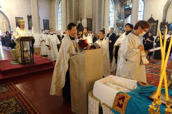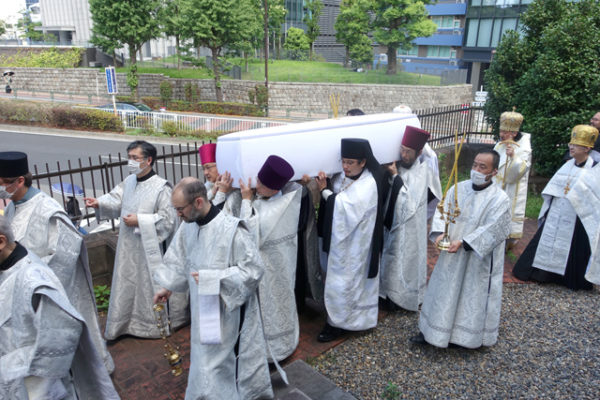 Στην Εξόδιο Ακολουθία χοροστάτησε ο Αρχιεπίσκοπος Σενντάι και Τοποτηρητής του Μητροπολιτικού Θρόνου κ. Σεραφείμ, συγχοροστατούντος του Προϊσταμένου του Μετοχίου της Ορθοδόξου Εκκλησίας της Ρωσίας στην Ιαπωνία Πρωθιερέα Νικολάου Κατσιουμπάν, ο οποίος εκφώνησε το συλλυπητήριο μήνυμα του Μακαριωτάτου Πατριάρχη Μόσχας και πασών των Ρωσιών κ.κ. Κυρίλλου.