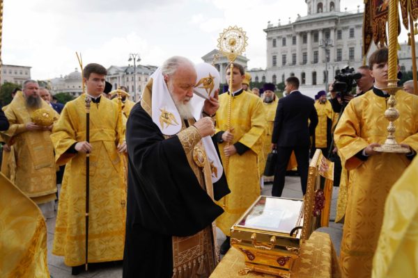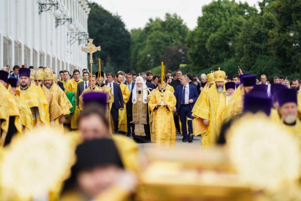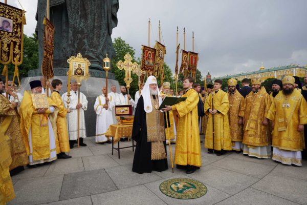 Ακολούθησε η λιτανεία μέσω των πυλών Μποροβίτσκιε του Κρεμλίνου έως τον αδριάντα προς τιμήν του Αγίου Ισαποστόλου Μεγάλου Πρίγκιπα Βλαδιμήρου, όπου ο Μακαριώτατος Πατριάρχης Μόσχας και πασών των Ρωσιών κ.κ. Κύριλλος προέστη της Δοξολογίας.
