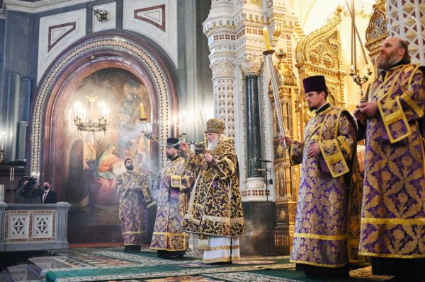 Με ολονυκτία τίμησαν την Κυριακή της Σταυροπροσκυνήσεως στο Καθεδρικό Ναό του Σωτήρος Χριστού στη Μόσχα.
