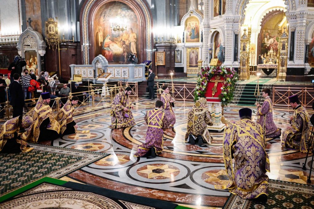 Με ολονυκτία τίμησαν την Κυριακή της Σταυροπροσκυνήσεως στο Καθεδρικό Ναό του Σωτήρος Χριστού στη Μόσχα.