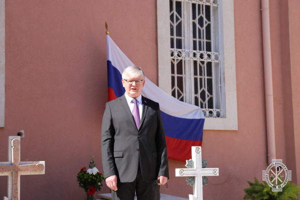 Στη συνέχεια, με τον ήχο του εθνικού ύμνου της Ρωσικής Ομοσπονδίας, οι συμμετέχοντες στην τελετή εναπόθεσαν στεφάνια και λουλούδια στον τάφο.