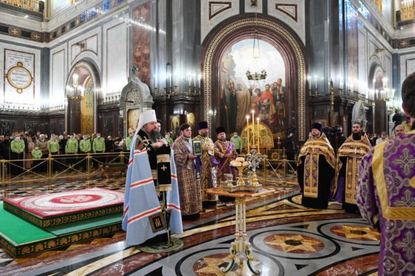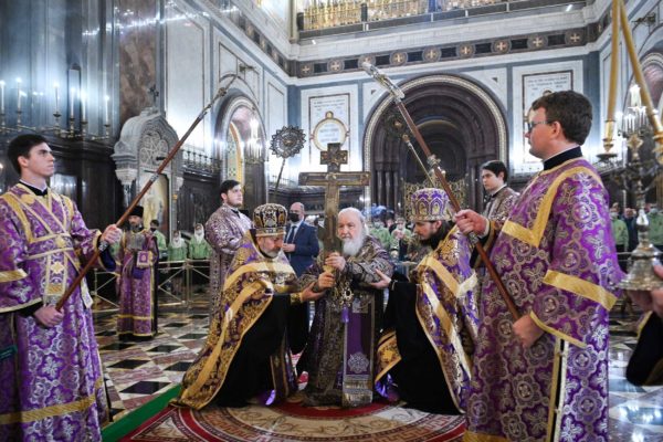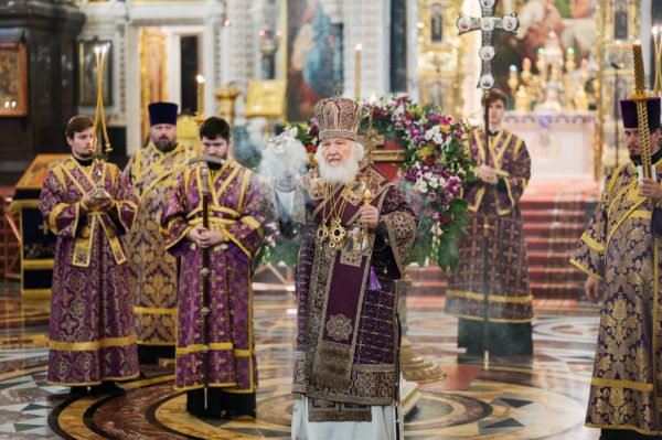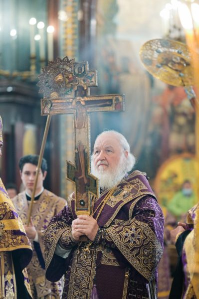 Ιερά Αγρυπνία τελέστηκε την παραμονή της εορτής της Υψώσεως του Τιμίου Σταυρού (με το παλαιό εορτολόγιο) στον Καθεδρικό Ναό του Σωτήρος Χριστού στη Μόσχα.