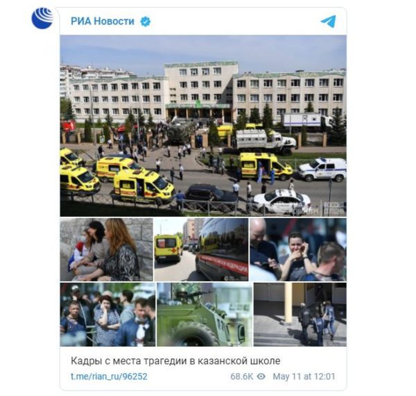 Τα συλλυπητήρια του για την τραγωδία στο σχολείο του Καζάν, όπου ένοπλοι άνοιξαν σήμερα (Τρίτη 11 Μαΐου) πυρ και σκότωσαν 9 ανθρώπους, μεταξύ των οποίων 7 παιδιά, ενώ τραυμάτισαν άλλους 16, εξέφρασε ο Μακαριώτατος Πατριάρχης Μόσχας και πασών των Ρωσιών κ.κ. Κύριλλος, σημειώνοντας δε ότι το περιστατικό εγείρει ζήτημα αναθεώρησης των κανόνων που διέπουν την οπλοκατοχή και οπλοχρησία.