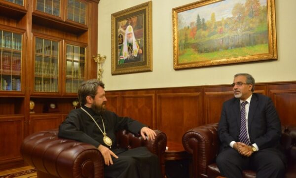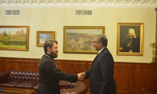 Ο Πρόεδρος του Τμήματος Εξωτερικών Εκκλησιαστικών Σχέσεων του Πατριαρχείου Μόσχας Μητροπολίτης Ιλαρίωνας του Βολικολαμάσκ υποδέχτηκε σήμερα τον ανώτατο ινδό διπλωμάτη Δ. Βενκάτσετ Βάρμα στο χώρο του Συνεδριακού Ιδρύματος του Έκτακτου και Πληρεξούσιου Πρέσβη της Ινδίας στη Ρωσική Ομοσπονδία.