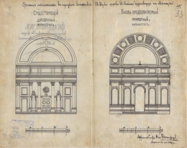 Σημειώνεται ότι μεταξύ των ευρεθέντων εγγράφων το μεγαλύτερο ενδιαφέρον έχουν τα σχέδια του παρεκκλησιού του Ναού του Αγίου Βασιλείου της Καισάρειας, τα σχέδια σε ακουαρέλα της πρόσοψης του Ιερού Ναού Αγίας Τριάδας στο Μπολσίε Λουζνικί καθώς και τα σχέδια του εικονοστασίου, που βρισκόταν στον τρούλο της εκκλησίας του Αγίου Νικολάου στην Μιασνίτσκαγια.