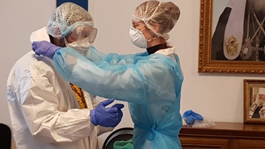 Ο π. Ιωάννης τόνισε πως “όλα τα μέσα προστασίας, όπως ειδική στολή, μάσκα, ποδονάρια, δύο ζευγάρια γάντια και γυαλιά πρέπει να ανακυκλώνονται μετά την τέλεση των μυστηρίων”.