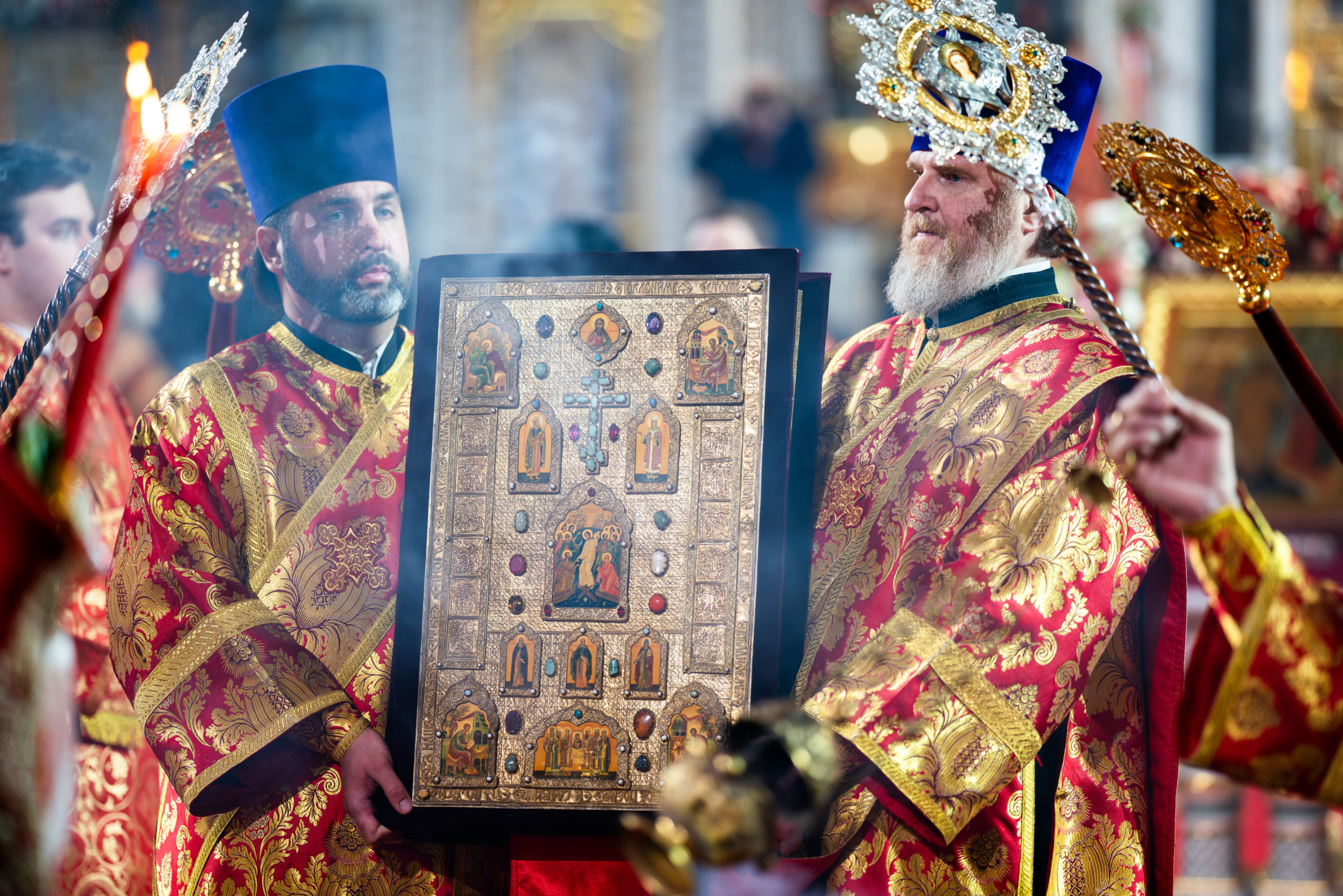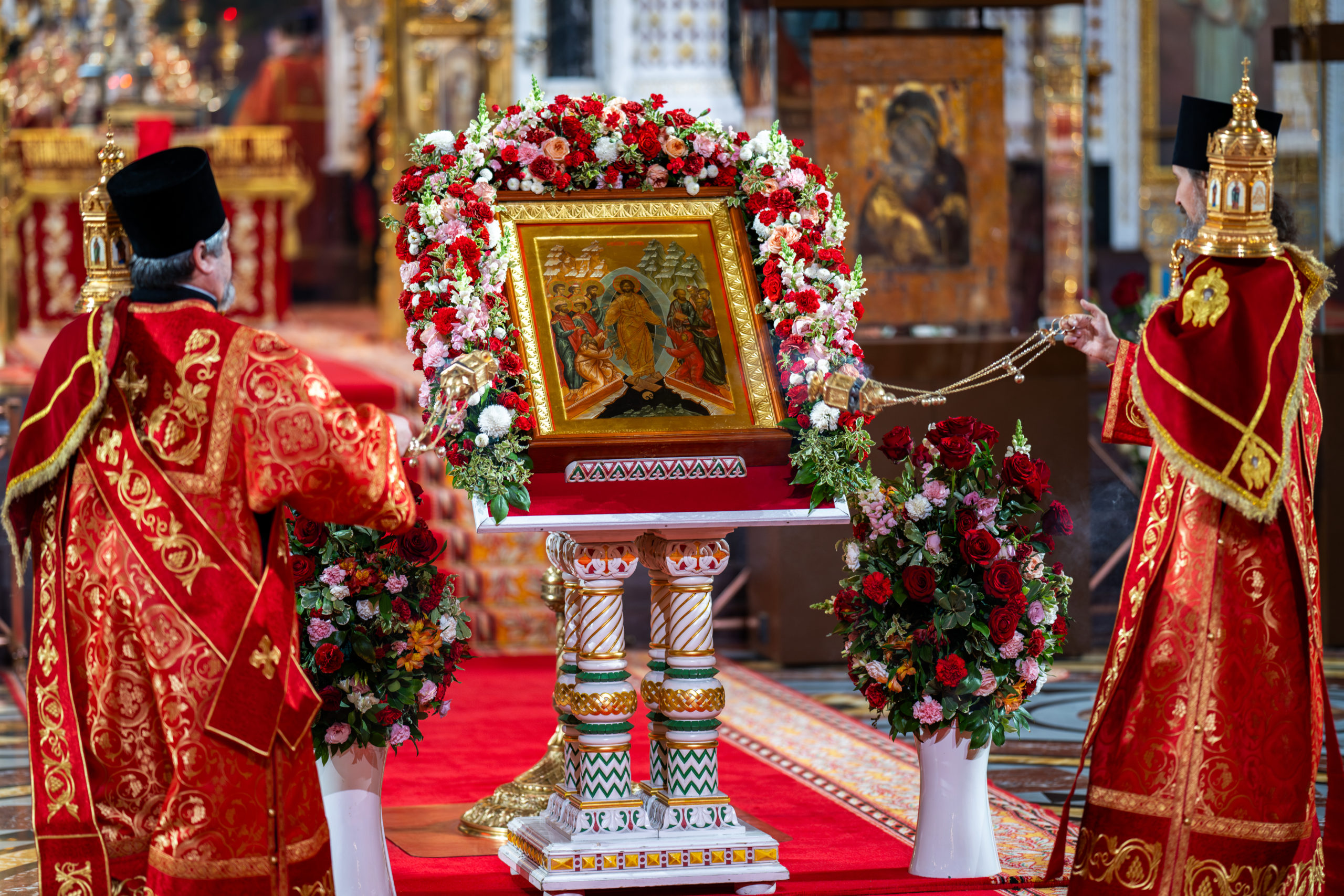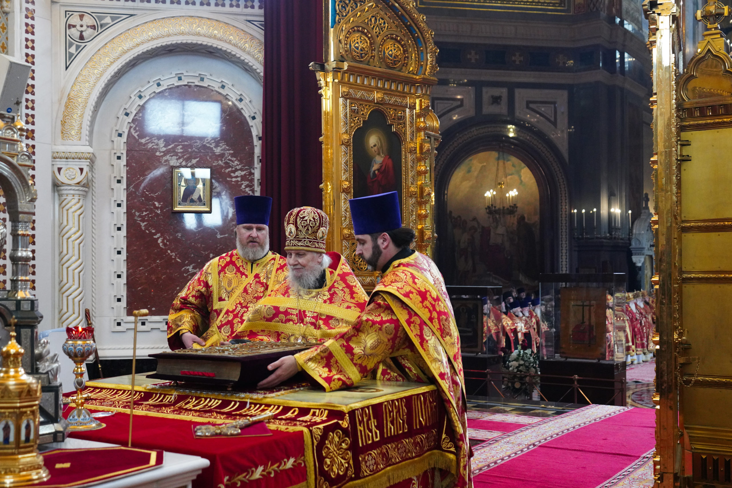 Σύμφωνα με την παράδοση, το αρχαίο Ευαγγέλιο της Αγίας Τράπεζας από την εποχή της Αυτοκράτειρας Ελισάβετ Πετρόβνα μεταφέρθηκε για τον Εσπερινό της Αγάπης. Δωρήθηκε από τον αείμνηστο Μητροπολίτη Πιτίριμ (Νετσάγιεφ) από τη Μονή Ιωσήφ-Βολοκολάμσκ στον Καθεδρικό Ναό του Σωτήρος Χριστού για ιδιαίτερα επίσημες εορταστικές ακολουθίες. Το Ευαγγέλιο μεταφέρεται μόνο δύο φορές το χρόνο: για τον Μεγάλο Εσπερινό της εορτής της Γέννησης του Χριστού και για τον Εσπερινό της Αγάπης.