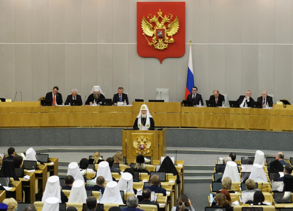 Στο τέλος της συνάντησης, ο Πατριάρχης Κύριλλος απευθύνθηκε ξανά στο κοινό: «Θα ήθελα να ευχαριστήσω ειλικρινά όλους και να σημειώσω ότι η σημερινή συνάντηση με τη μεγάλη συμμετοχή των βουλευτών της Κρατικής Δούμας και εκπροσώπων του κοινού και της Εκκλησίας, πραγματοποιήθηκε σε πολύ ήρεμη, ευγενική και καλοκάγαθη ατμόσφαιρα, η οποία χαρακτηρίζει γενικά την επικοινωνία των ομοϊδεατών ανθρώπων… Και σε αυτό το σημείο, θα ήθελα να σταματήσω και να πω το εξής: κάθε άτομο έχει το δικαίωμα να επιλέξει, κάθε άτομο είναι ανεξάρτητο, πίσω του έχει τη δική του ιστορία, οικογένεια, εκπαίδευση, ανατροφή, θρησκευτική πίστη και σχέση με το θείο και ούτω καθεξής. Αλλά όταν άνθρωποι διαφορετικών ιστορικών πεπρωμένων, με διαφορετικές βιογραφίες συγκεντρώνονται στο όνομα μιας μεγαλοπρεπούς ιδέας -και η Κρατική Δούμα δεν μπορεί παρά να συγκεντρωθεί γύρω από μια υψηλή ιδέα, γιατί το μέλλον της χώρας εξαρτάται από το έργο σας, – τότε όλες αυτές οι ανθρώπινες απόψεις, πρέπει, φυσικά, να υποχωρήσουν για το καλό του συνόλου. Όχι στο όνομα μιας τεχνητής συναίνεσης που επιβάλλεται από το εξωτερικό, αλλά ως αποτέλεσμα της επιλογής των ίδιων των βουλευτών υπέρ του μέλλοντος της Ρωσίας, η οποία θα καθορίσει την ανεξάρτητη, κυρίαρχη, πνευματικά και ουσιαστικά ισχυρή ανάπτυξη της χώρας».