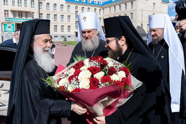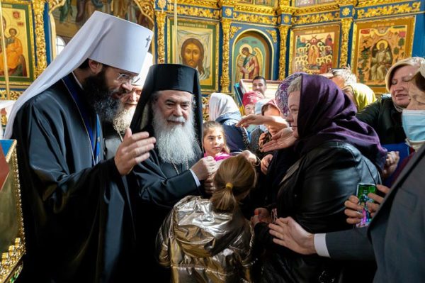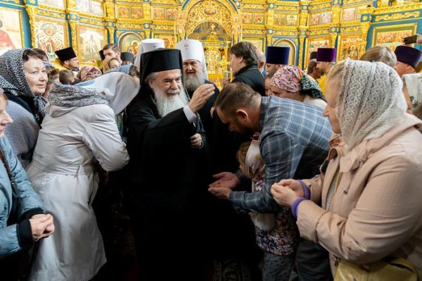 Από την πλευρά του ο Μακαριώτατος Πατριάρχης Ιεροσολύμων κ.κ. Θεόφιλος Γ’ στην ομιλία του προς τους παρευρισκόμενους, εξέφρασε τη χαρά του για την επίσκεψη στο Ναό, τον οποίο, όπως είπε, επισκέφθηκε για πρώτη φορά το 2012, καθώς και για τη συνάντηση του με την Ορθόδοξη κοινότητα της πρωτεύουσας του Καζακστάν. Επίσης, ο Μακαριώτατος προσέφερε στον Καθεδρικό Ναό ως δώρο έναν σταυρό προερχόμενο από τον Πανάγιο Τάφο.