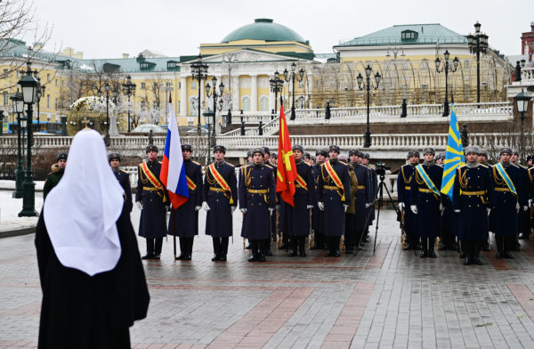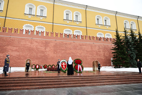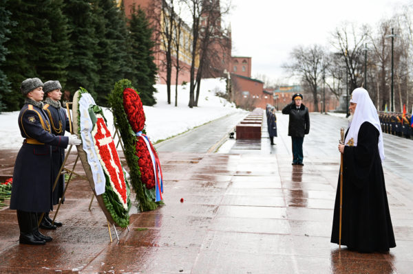 Συγχαίροντας τους Ρώσους στρατιώτες για την Ημέρα του Υπερασπιστή της Πατρίδας, στις 23 Φεβρουαρίου 2022, ο Μακαριώτατος Πατριάρχης Μόσχας και πασών των Ρωσιών κ.κ. Κύριλλος κατέθεσε στεφάνι στον τάφο του Άγνωστου Στρατιώτη στον Κήπο του Αλεξάνδρου κοντά στα τείχη του Κρεμλίνου της Μόσχας.