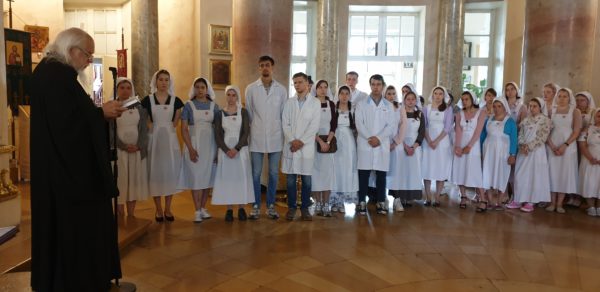 Την ημέρα της αποφοίτησης, πραγματοποιήθηκε Θεία Λειτουργία στην εκκλησία του Τσάρου Δημητρίου στο πρώτο νοσοκομείο της πόλης. Μάλιστα, την Θεία Λειτουργία τέλεσε ο πνευματικός της σχολής, πρόεδρος του Συνοδικού Τμήματος Πρόνοιας και Ευποιίας της Εκκλησίας, επικεφαλής της Επιτροπής νοσοκομειακών υπηρεσιών στο Επισκοπικό Συμβούλιο της Μόσχας, Επίσκοπος Ορέχοβο Ζούγιεβο κ. Παντελεήμων. Στο τέλος της λειτουργίας, ο επίσκοπος απευθύνθηκε στους μελλοντικούς νοσηλευτές, λέγοντας: