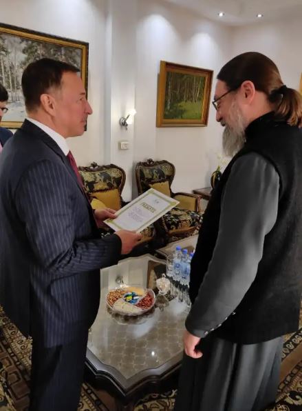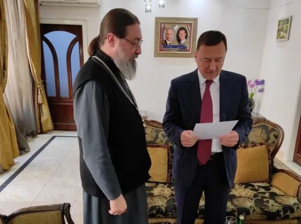 Ο Αρχιμανδρίτης Φίλιππος επέδωσε στον Ρώσο Πρέσβη ευχαριστήρια επιστολή εκ μέρους του Γραφείου Αντιπροσωπεύσεως της Ρωσικής Ορθοδόξου Εκκλησίας στη Δαμασκό, για την συνδρομή του στην οργάνωση της επίσκεψης του Προέδρου του Τμήματος Εξωτερικών Εκκλησιαστικών Σχέσεων του Πατριαρχείου Μόσχας Μητροπολίτη Βολοκολάμσκ κ. Αντωνίου στο Πατριαρχείο Αντιοχείας τον περασμένο Ιανουάριο.