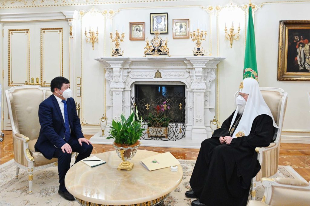 Ο Μακαριώτατος Πατριάρχης Μόσχας και πασών των Ρωσιών κ.κ. Κύριλλος δέχθηκε τον Έκτακτο και Πληρεξούσιο Πρέσβη της Λαϊκής Δημοκρατίας της Κίνας στη Ρωσική Ομοσπονδία Zhang Hanhui, στην Πατριαρχική και Συνοδική Κατοικία στη Μονή Ντανίλοφ στη Μόσχα, στις 3 Μαρτίου 2022.