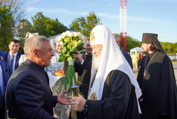 Στο αεροδρόμιο του Καζάν, τον Προκαθήμενο της Εκκλησίας της Ρωσίας υποδέχθηκαν θερμά ο Κυβερνήτης του Ταταρστάν Ρουστάμ Μινιχάνοφ, ο Μητροπολίτης Καζάν και Ταταρστάν κ. Κύριλλος και ο Πρόεδρος του Φιλελεύθερου Δημοκρατικού Κόμματος της Ρωσίας Λεονίντ Σλούτσκι.
