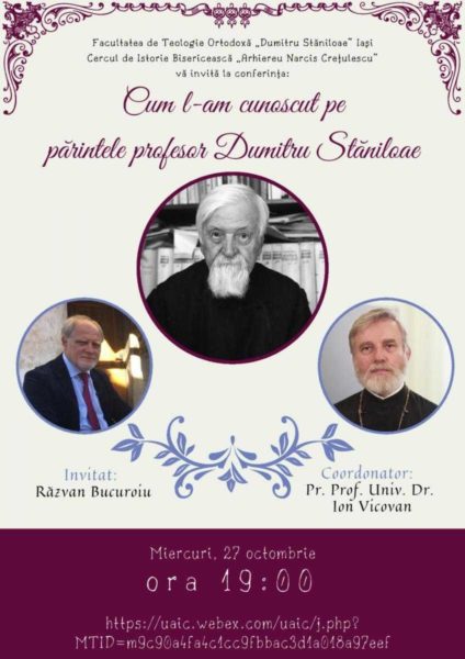 Το πρώτο συνέδριο θα πραγματοποιηθεί την Τετάρτη, 27 Οκτωβρίου, στις 19:00, στην πλατφόρμα Webex και διοργανώνεται από τον Κύκλο Ιστορίας της Εκκλησίας «Επίσκοπος Narcis Creţulescu» της Θεολογικής Σχολής στο Ιάσιο. Προσκεκλημένος της εκδήλωσης είναι ο δημοσιογράφος Răzvan Bucuroiu και συντονιστής της συνάντησης ο πατέρας Dean Ion Vicovan. Το συνέδριο έχει τίτλο «Πώς γνώρισα τον πατέρα και καθηγητή Dumitru Staniloae».