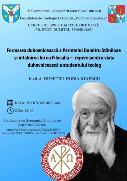 Η δεύτερη δραστηριότητα θα πραγματοποιηθεί την Παρασκευή 29 Οκτωβρίου στις 18.00, στο Zoom, και διοργανώνεται από τον Ορθόδοξο Πνευματικό Κύκλο «Π. Καθ. Dumitru Stăniloae». Καλεσμένος του συνεδρίου είναι ο συγγραφέας Dumitru Horia Ionescu. Το θέμα της εκδήλωσης είναι «Η πνευματική συγκρότηση του π. Dumitru Stăniloae και η συνάντησή του με τη Φιλοκαλία – ορόσημα για την πνευματική ζωή του φοιτητή θεολογίας».