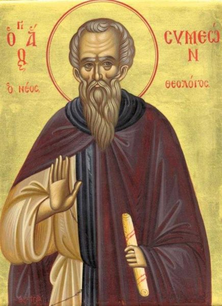 «Ο Άγιος Συμεών ο Νέος Θεολόγος (949-1022) γεννήθηκε και έζησε στην Κωνσταντινούπολη και από την εφηβεία εισήλθε στον μοναχισμό. Σε ηλικία μόλις 20 ετών ο Άγιος Συμεών ο Νέος Θεολόγος είχε την πρώτη πνευματική εμπειρία να δει το άκτιστο φως, μαρτυρία του ζήλου που είχε για την καθαρή ζωή και την άσκηση της προσευχής.