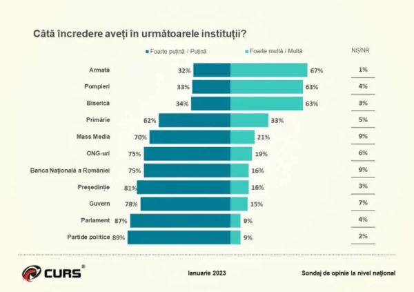 Οι Ρουμάνοι πολίτες που συμμετείχαν στην έρευνα ρωτήθηκαν, μεταξύ άλλων, για την εμπιστοσύνη στους θεσμούς. Στρατός, Πυροσβεστική και Εκκλησία κατατάχθηκαν στις τρεις πρώτες θέσεις. Αναλυτικότερα τη πρώτη θέση με 67% κατέχει ο Στρατός και ακολουθούν, με 63% , Πυροσβεστική και η Εκκλησία.