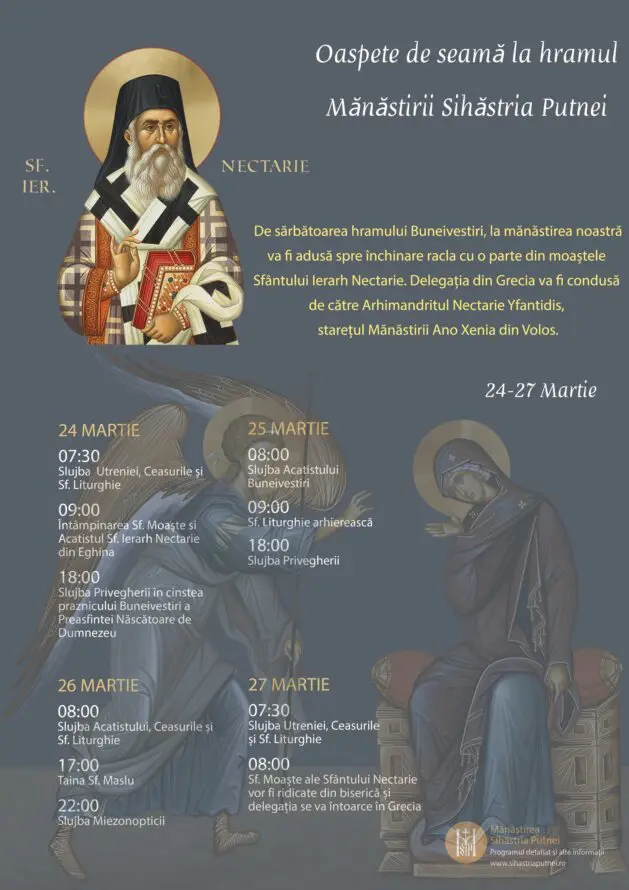 Με την ευκαιρία του Ευαγγελισμού της Θεοτόκου, απότμημα των λειψάνων του Αγίου Νεκταρίου θα μεταφερθεί στην Ιερά Μονή Συχαστρίας στη Ρουμανία.