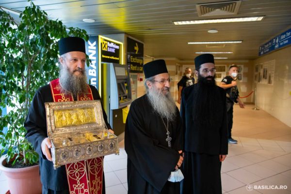 Τον Καθηγούμενο της Σιμωνόπετρας Αρχιμανδρίτη Ελισαίο μαζί με την αδελφότητα όπου συνόδευσαν τα ιερά λείψανα υποδέχτηκε στο Αεροδρόμιο του Βουκουρεστίου “Otopeni” ο Θεοφιλέστατος Επίσκοπος Πραχοβεανούλ κ. Τιμόθεος.