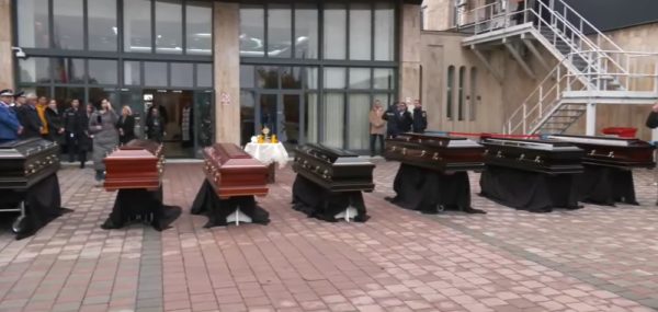 Εμφανώς συγκινημένος ο Σεβασμιώτατος Αρχιεπίσκοπος Τιμισοάρας και Μητροπολίτης Βανάτου κ. Ιωάννης τέλεσε το Τρισάγιο στην ελληνική και ρουμανική γλώσσα, αφήνοντας ένα λευκό τριαντάφυλλο πάνω σε κάθε φέρετρο. Με φωνή που λύγιζε, ανέγνωσε τα ονόματα των επτά νέων και απηύθυνε λόγο παρηγοριάς προς τους παρισταμένους και τα μέλη της ελληνικής διπλωματικής αποστολής.