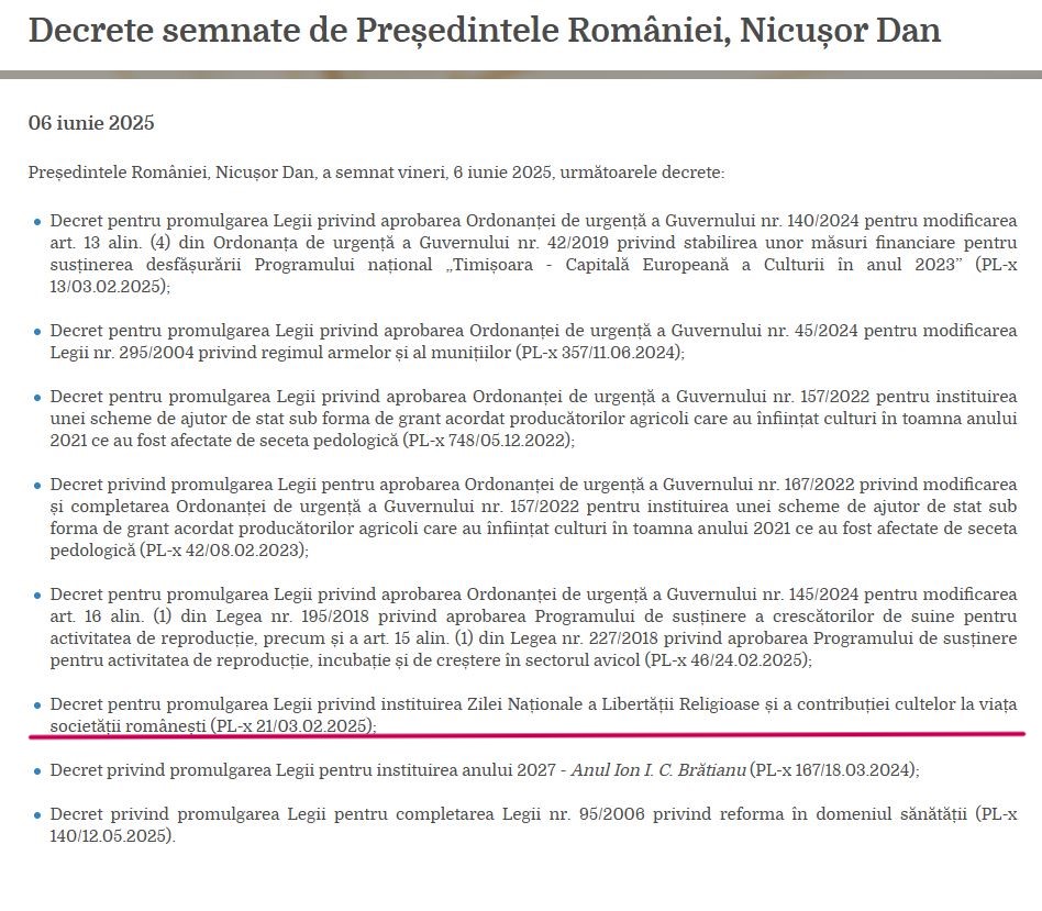 Ο Πρόεδρος της Ρουμανίας Νικούσορ Νταν υπέγραψε, την Παρασκευή, διάταγμα σύμφωνα με το οποίο η 16η Μαΐου θα εορτάζεται ως Εθνική Ημέρα Θρησκευτικής Ελευθερίας και Συμβολής των Θρησκειών στη Ζωή της Ρουμανικής Κοινωνίας.