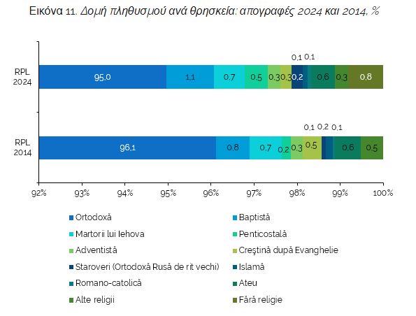 Η πλειονότητα των ερωτηθέντων δήλωσε ότι είναι Ορθόδοξοι Χριστιανοί (95,0%), ενώ το 1,1% Βαπτιστές, το 0,7% Μάρτυρες του Ιεχωβά, το 0,5% Πεντηκοστιανοί, το 0,3% Αντβεντιστές, το 0,6% άθεοι και καμία θρησκεία το 0,8%: