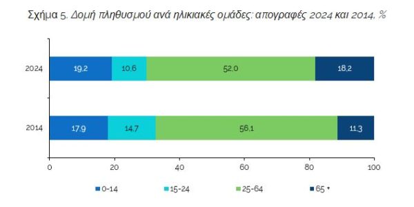Ακόμη, το δημογραφικό πρόβλημα γίνεται αισθητό καθώς αυξηθηκε κατά 18% η ηλικιακή ομάδα άνω των 65 ετών, ενώ μειώθηκε κατά 4% η ηλικιακή κατηγορία 15-64 ετών. Πολύ μικρή αύξηση, 1,2%, σημειώθηκε στο τμήμα του πληθυσμού ηλικίας έως 14 ετών: