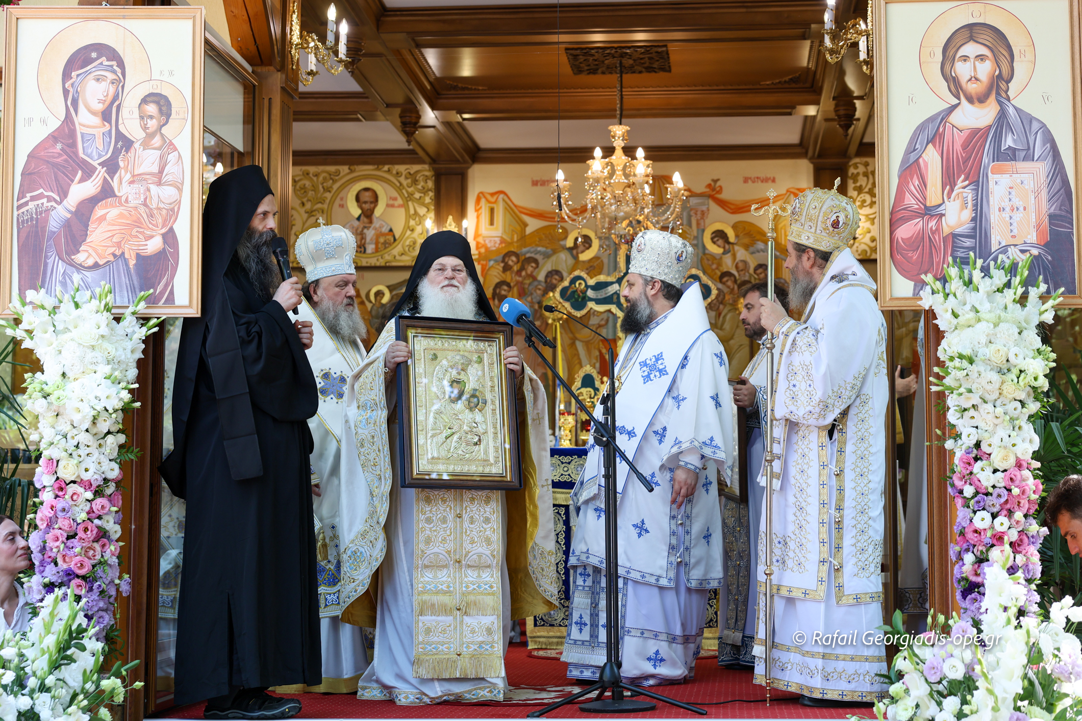 Στο τέλος της Θείας Λειτουργίας ο η Κοινότητα του Εθνικού Καθεδρικού Ναού δώρισε ένα αντίγραφο της ιεράς εικόνας της Παναγίας της “Προδρομίτισσας” προς του Θεοφιλεστάτους Επισκόπους και τον Καθηγούμενο της Μονής Βατοπαιδίου, Γέροντα Εφραίμ.